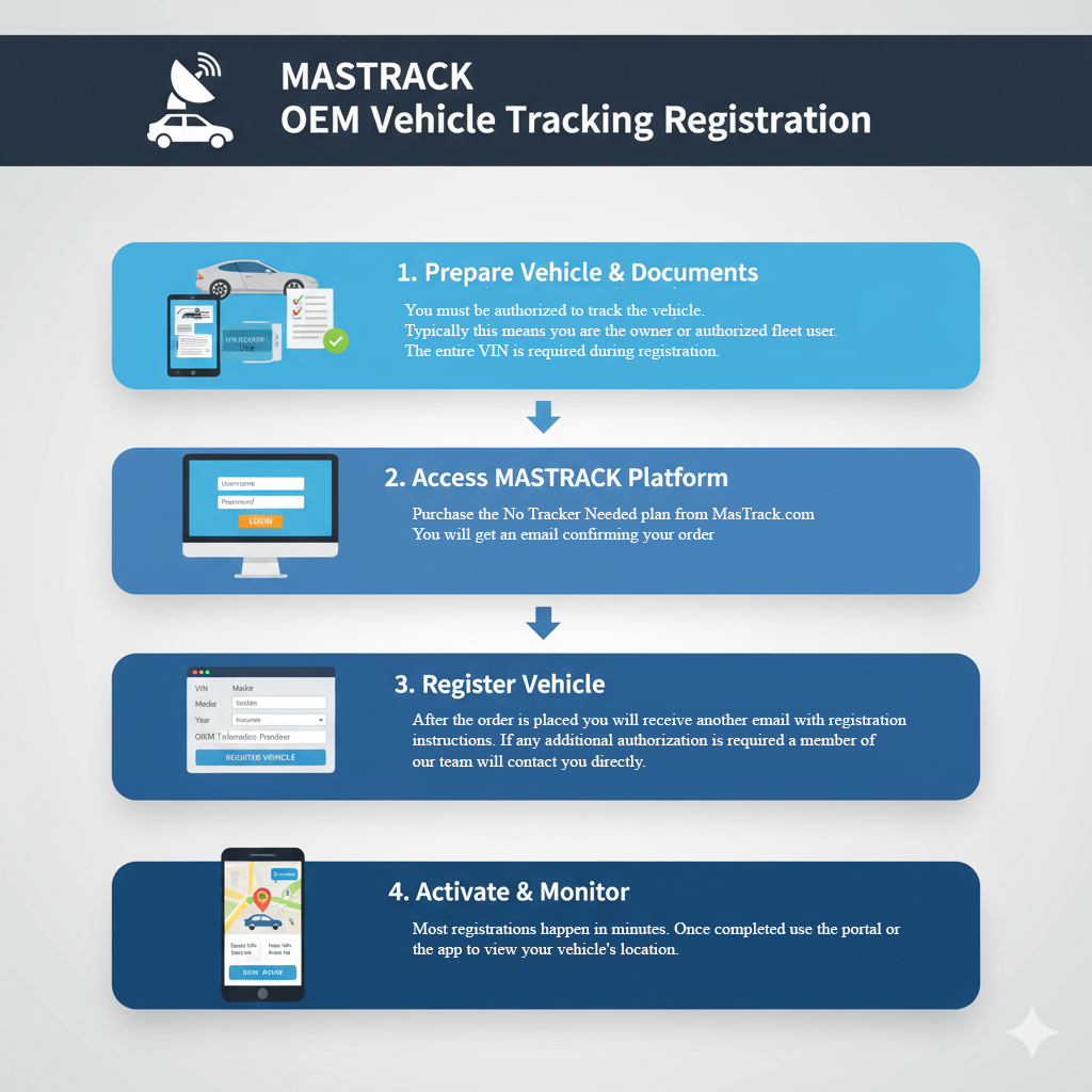 You must be authorized to track the vehicle. Typically this means you are the owner or authorized fleet user. If you do not meet the manufacturer's requirements and proceed to make this purchase anyway, tracking will NOT be enabled on your vehicle.